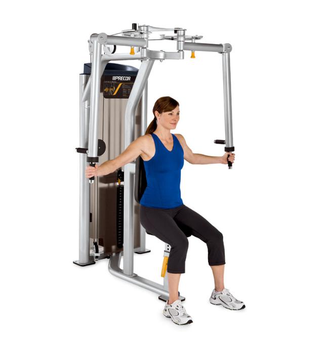想增加肌肉塊,杠鈴練習(xí)是最重要、最基本的練習(xí)。建議初學(xué)者將杠鈴練習(xí)放到第一步,因?yàn)楦茆従毩?xí)的動(dòng)作幅度相對(duì)較小,所以必須從不同的角度(上斜和下斜)、使用不同的握距刺激整個(gè)胸部肌肉。相對(duì)簡(jiǎn)單安全的練習(xí)方法是平板杠鈴臥推,能有效鍛煉整個(gè)胸部、增加厚度。先平躺在臥推凳上,雙腳自然地放在地上,然后調(diào)整身體的前后位置,使眼睛位于臥推架上杠鈴的正下方。握距比肩稍寬,從臥推架上取下杠鈴,慢速下放杠鈴,直到上臂與地面平行為止。如此重復(fù)練習(xí)三四組,每組大概12-15次歐推動(dòng)作,具體視個(gè)人身體條件。熟練之后,可以做下斜杠鈴臥推,重點(diǎn)鍛煉下胸部肌肉,操作難度稍微加強(qiáng)。 蝴蝶機(jī)———胸肌分離度