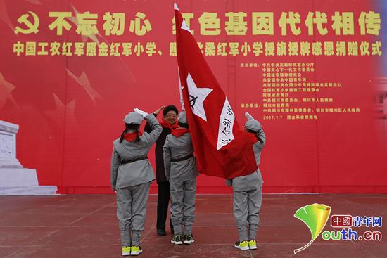 在1月7日舉行的中國(guó)工農(nóng)紅軍照金紅軍小學(xué)、照金北梁紅軍小學(xué)授旗授牌儀式現(xiàn)場(chǎng),第十屆全國(guó)人大常委會(huì)副委員長(zhǎng)、全國(guó)紅軍小學(xué)建設(shè)工程理事會(huì)榮譽(yù)理事長(zhǎng)顧秀蓮親手為兩所紅軍小學(xué)的少先隊(duì)員授旗!≈袊(guó)青年網(wǎng)記者 李拓 攝