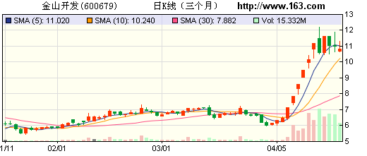 從3月30日至4月17日,金山開發(fā)(600679.SH)連拉9根陽(yáng)線,股價(jià)從低點(diǎn)6.03元/股暴漲至12.20元/股,期間最高漲幅高達(dá)102.32%,成為兩市近期一大牛股。在股價(jià)暴漲的背后,除了公司具有小貸公司概念外,還有市場(chǎng)對(duì)公司重組的預(yù)期。